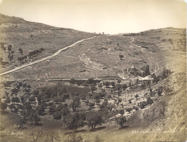 Долина Йосафата, Феликс Бонфилс, около 1870 года. Фото номер 290. Оригинал: старинная белковая печать на тонком листе бумаги, цвет сепия, поверхность слегка глянцевая, подпись на негативе. На фото изображен северный вход в долину Иосафата, или Кедронскую долину. Дорога слева - это дорога в Иерихон, которая проходит через Betheny. Выше и ниже дороги видны многочисленные каменные могильные плиты. Это еврейское кладбище на Масличной горе. Памятник в центре называют гробницей Авессалома, сына царя Давида. В долине находится множество различных памятников такого рода, все они датированы 2-м или 1-м веком до нашей эры. Эта фотография документирована в списке Фотографий Феликса Бонфилса в отделе редких книг библиотеки Принстоунского университета, Box 6, папка 15.